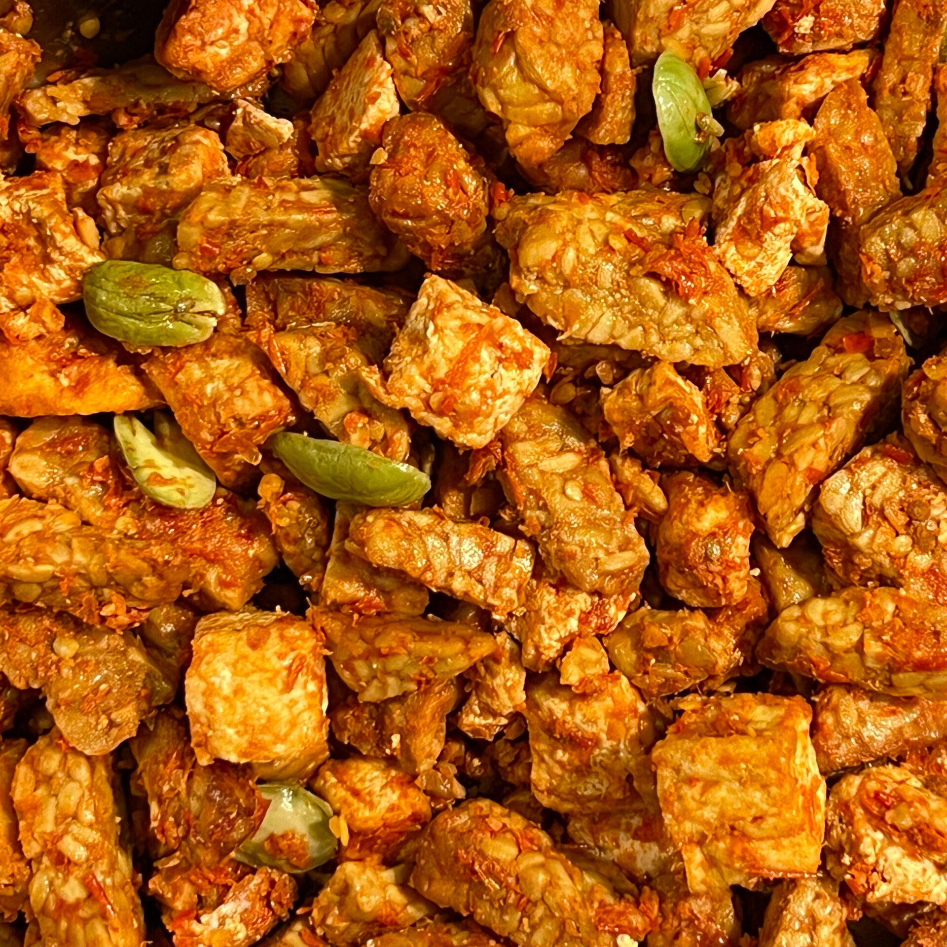 Gebakken tempeh en tahu in onze pittige balado saus. Heerlijk bereid met peteh bonen.